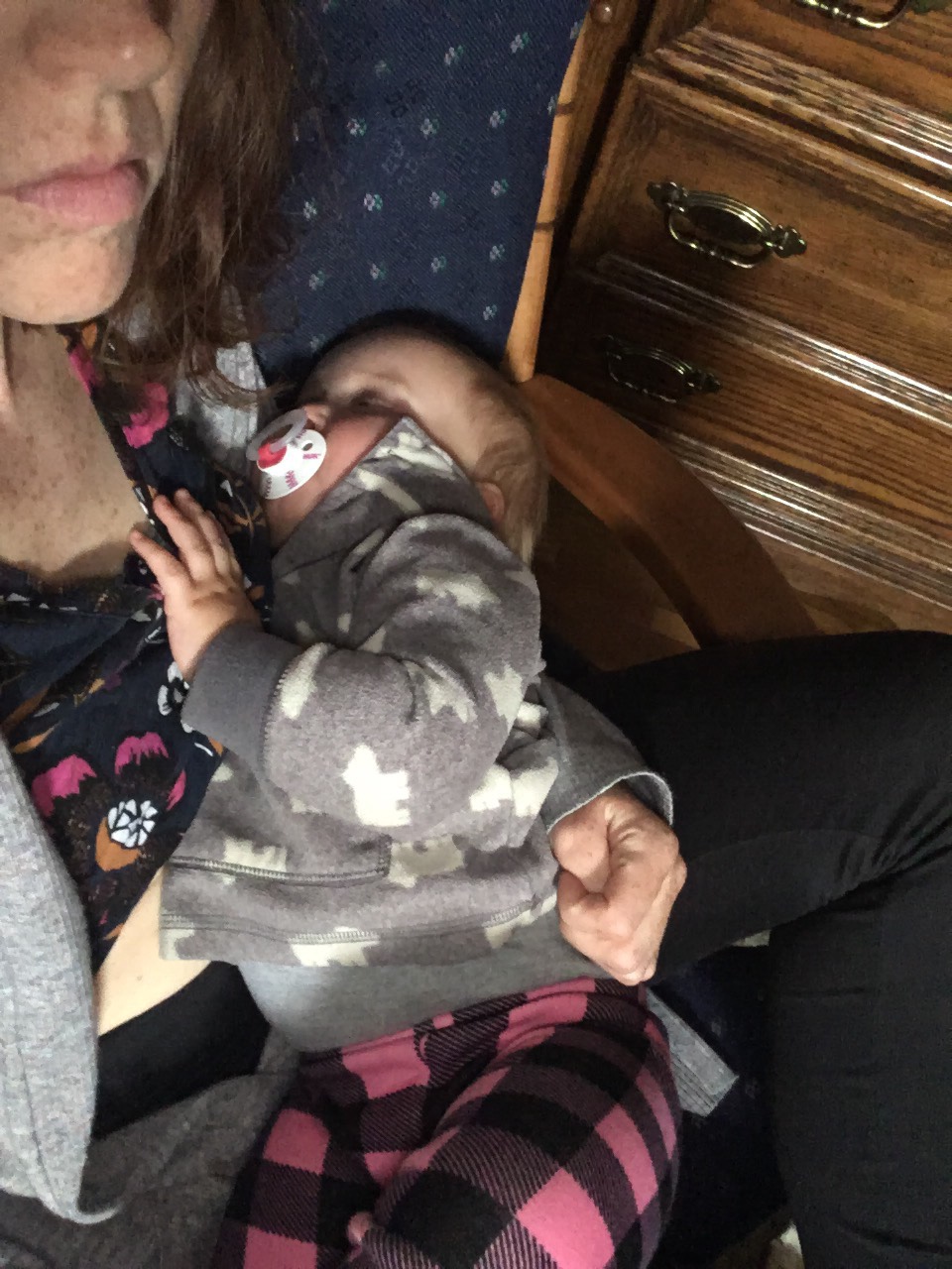 Course she never sleeps for the whole two hours. She sleeps 30m (after I rock her for an hour) and then wants to be rocked until it’s five minutes past the time I should’ve left to pick my son up from kindergarten.